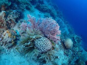 Possible encounters with pelagics. Porcelain coral slope. The atmosphere is unique. Groupers are easy to spot. The slope ends at a depth of 30-40 meters on a sandy slope. The colors are darker than at other dive sites.