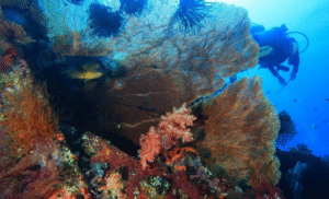 TOPOGRAPHY: Coral reef around the structure – Coral growth on the ship – Sandy slope